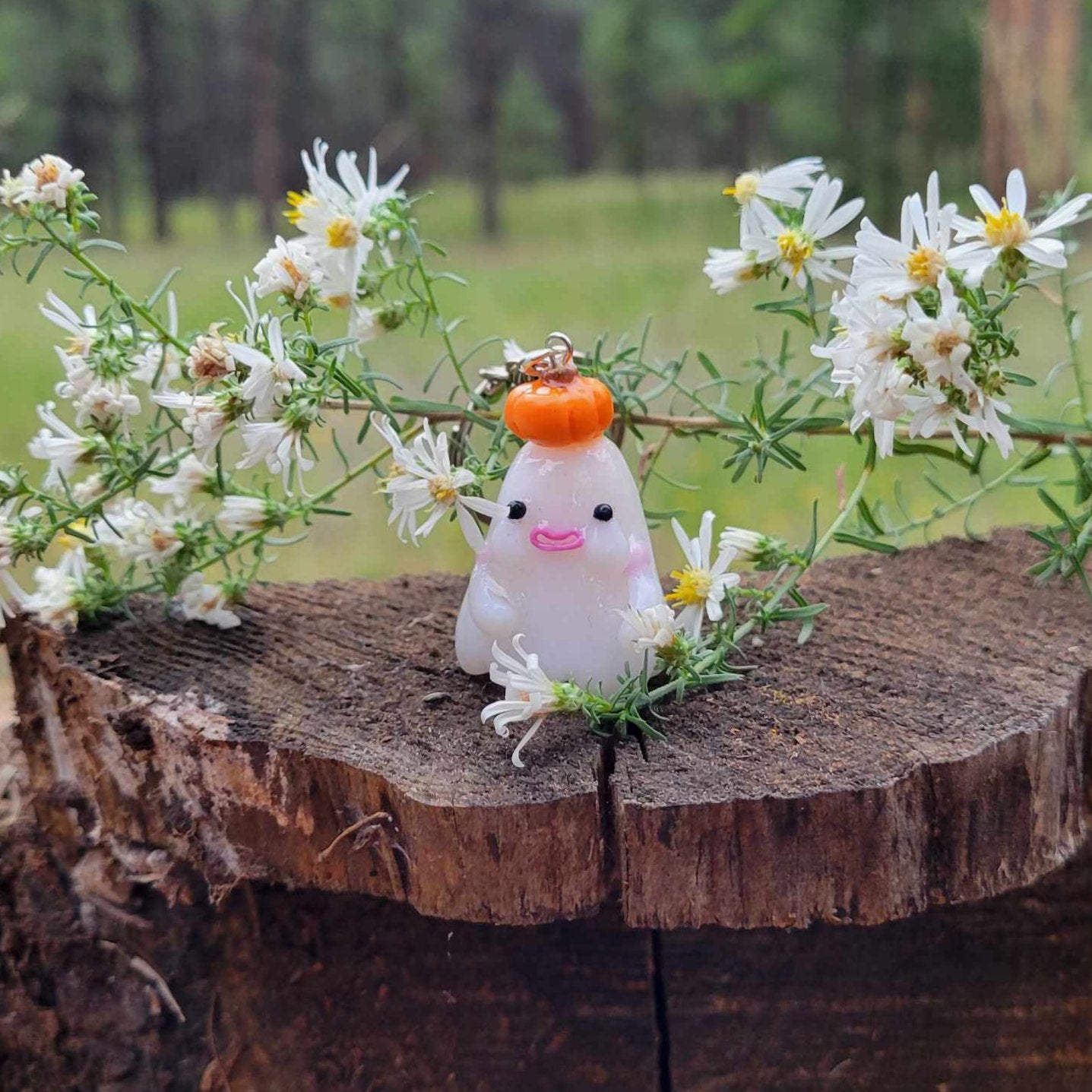 This ghost keychain isn’t here to scare you—it’s here to awkwardly make eye contact and wonder if you’re free for brunch. Hand-sculpted with too much love, this lil' guy's just trying his best. Comes with a pumpkin hat, because why wouldn’t it?